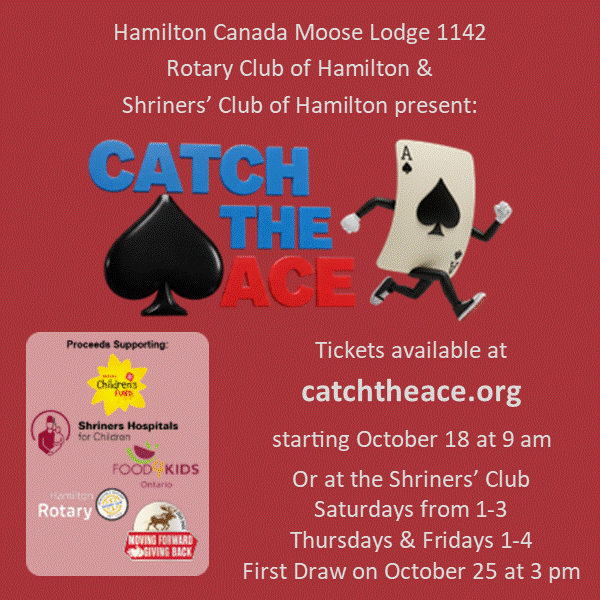 Thanks to everyone who came out and supported the Shrine Club of Hamilton by purchasing tickets for Catch the Ace. With your help we were able to raise over $13000 for the Transportation Fund in support of the Shriners’ Hospitals for Children – Canada.